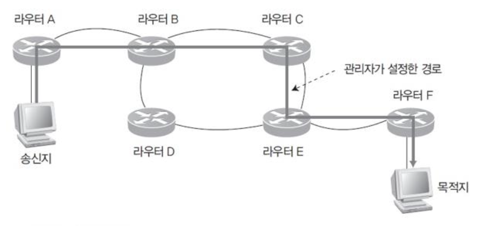| - 초기에 관리자가 다양한 라우팅 정보를 분석한 최적의 경로 설정 가능 - 라우팅 알고리즘을 통한 경로 설정이 이루어지지 않아 처리 부하 감소 - 네트워크 환경 변화에 대한 능동적인 대처가 어려움 - 네트워크 환경 변화 시 관리자가 경로를 재산출하여 각 라우터에 제공해야 함 - 비교적 환경 변화가 적은 형태의 네트워크에 적합 |