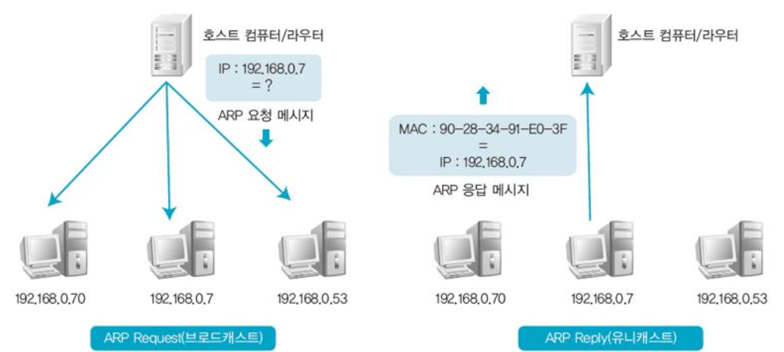 - 데이터를 전달하려는 IP 주소와 통신에 필요한 물리적인 주소(MAC)를 알아내는 프로토콜