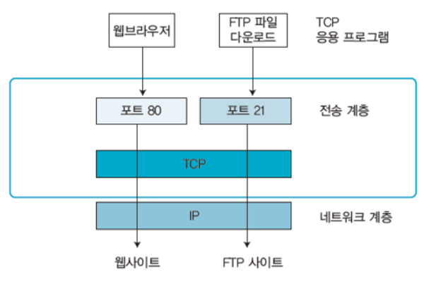 - 포트는 TCP가 상위 계층으로 데이터를 전달하거나 상위 계층에서 TCP로 데이터를 전달할 때 상호 간에 사용하는 데이터의 이동 통로를 말함