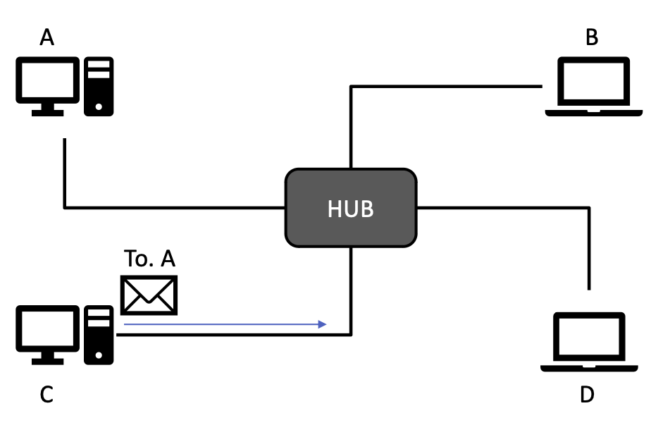 - 허브는 스위치와 형태나 사용 방법이 같지만 패킷을 모든 곳에 똑같이 복사해서 보내는 것이 다름(스위치는 목적지에만 데이터를 전송)