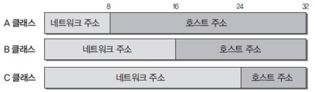 - A, B, C, D, E 클래스로 구분하는데 각 클래스는 네트워크 부분과 호스트 부분으로 구성