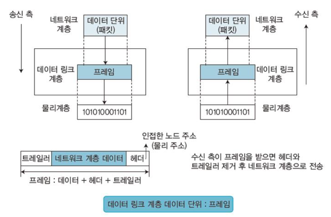 네트워크 계층에서 받은 데이터 단위(패킷)를 프레임으로 구성하여 물리 계층으로 전송함
