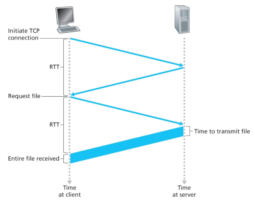 - non-persistent HTTP ressponse time = 2RTT + file transmission time (RTT: 패킷이 클라이언트와 서버를 이동하는 시간)