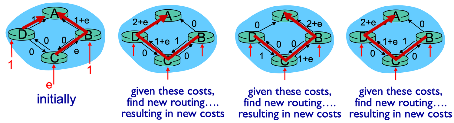 - B 입장에서 B→A의 cost=1+e, B→C→D→A의 cost=0+0+0+1=1이므로 패킷을 B→C→D→A의 경로로 보내기로 결정