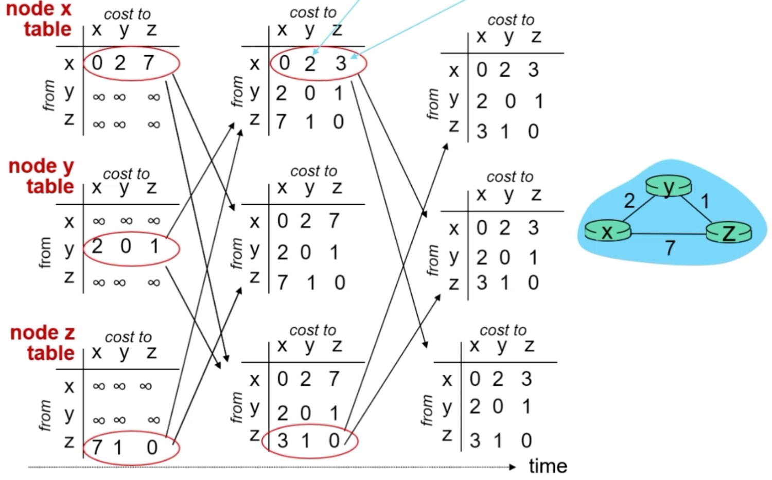 D_z(x) = min{c(z,x), c(y,z)+D_y(x)} = min{50, 1+6} = 7 - 이후 D_y(x)=8 → D_z(x)=9 → …