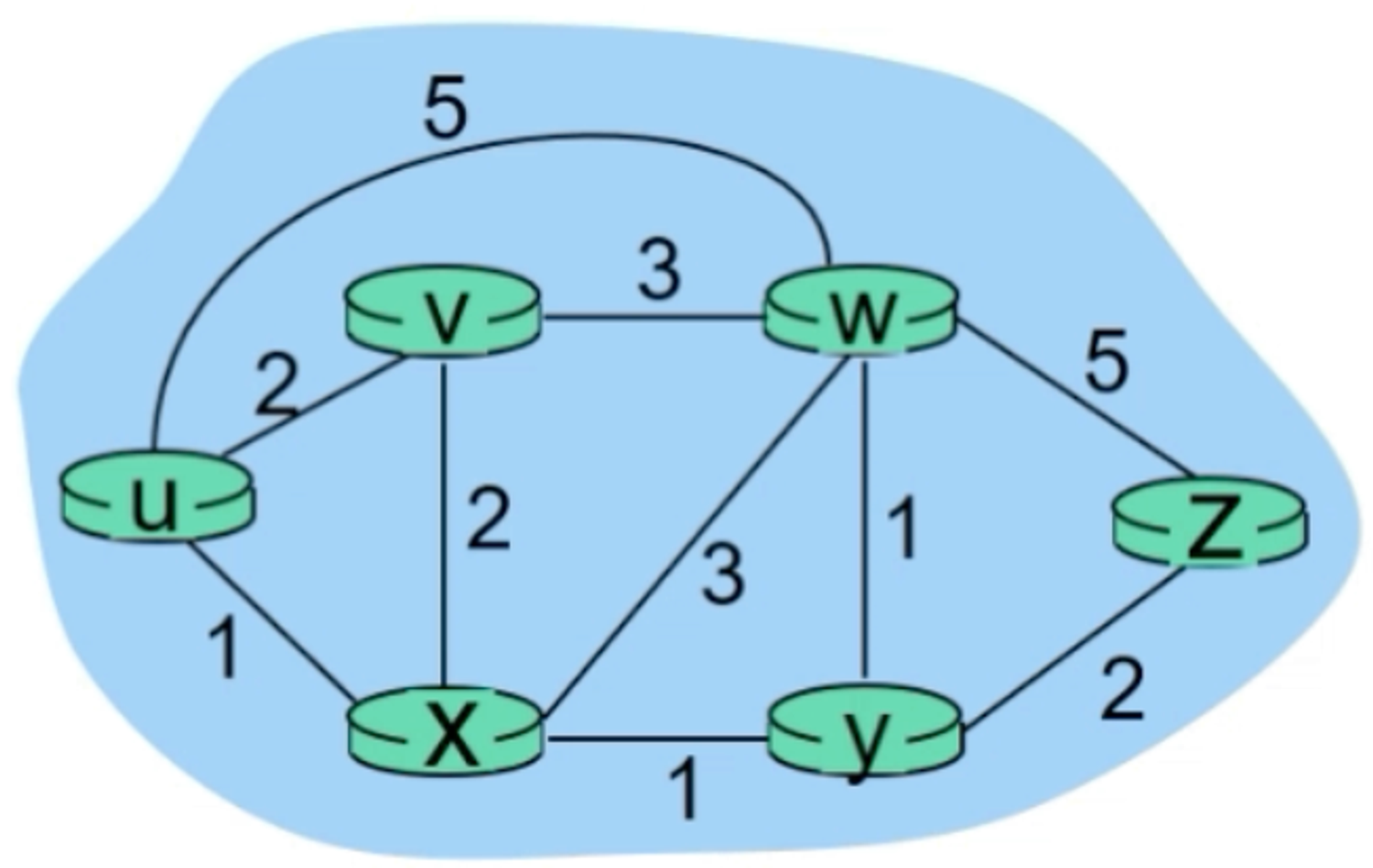 d_u(z) = min{c(u,v) + d_v(z), c(u,x) + d_x(z), c(u,w) + d_w(z)}