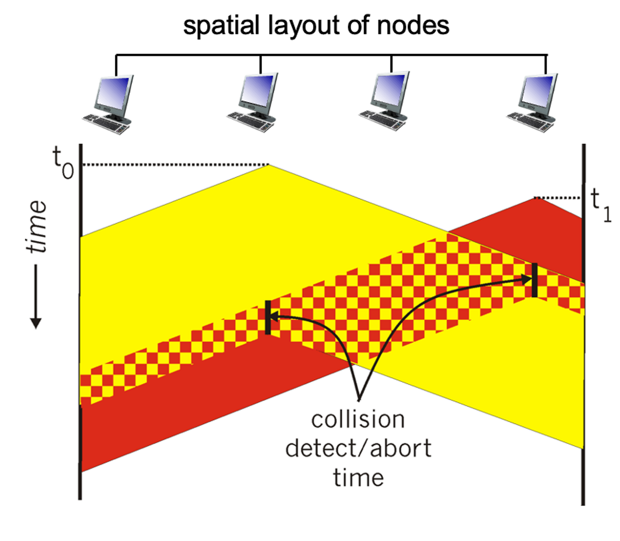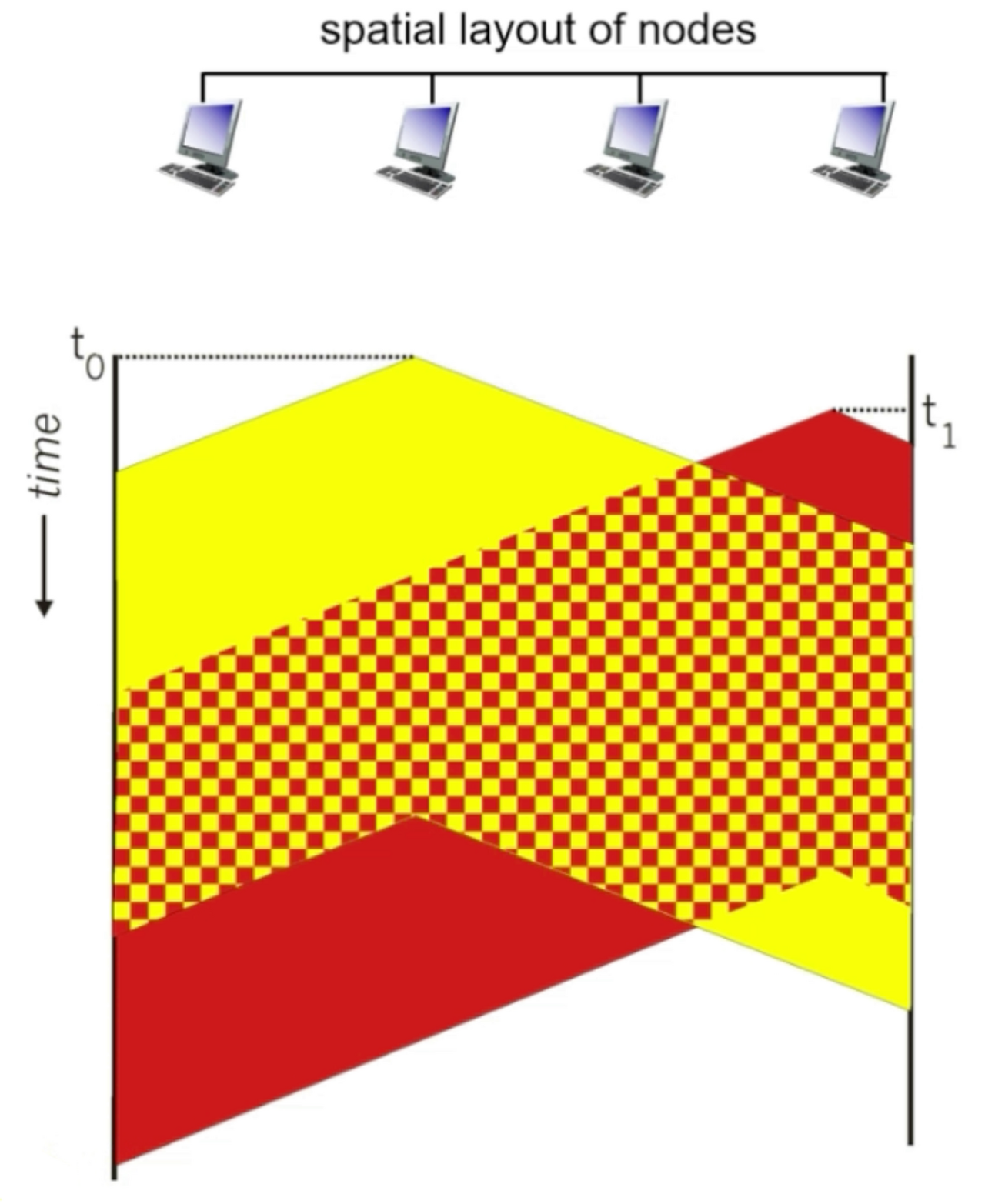 전파 지연으로 인해 두 노드가 서로 프레임을 전송하는 것을 감지하지 못하고 프레임을 전송하여 충돌 발생