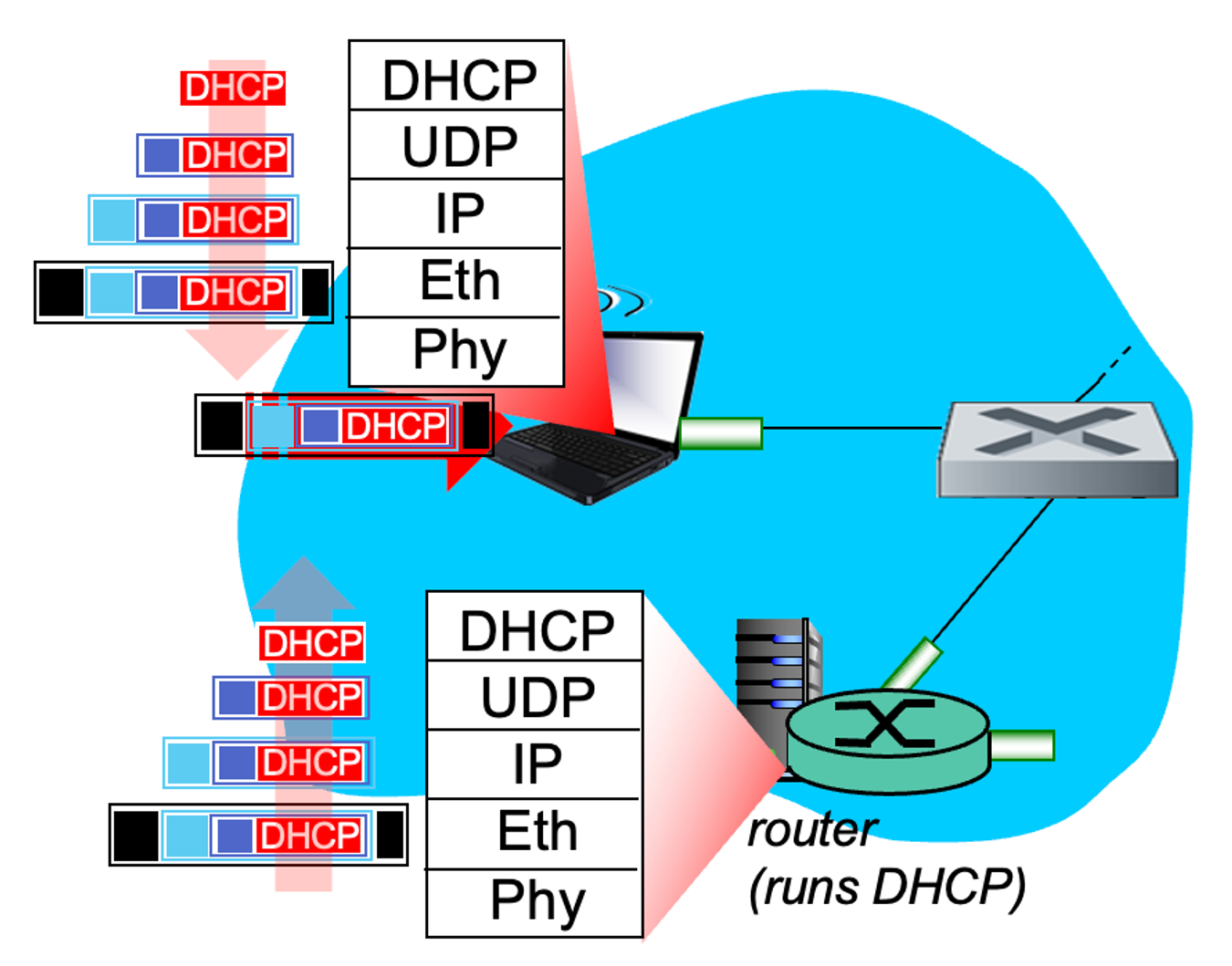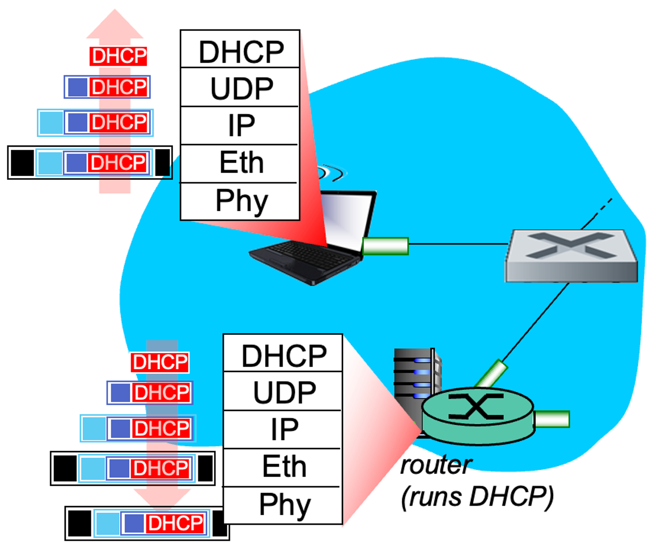 노트북을 연결하려면 자체 IP 주소, first-hop 라우터의 주소, DNS 서버의 주소 필요: DHCP 사용