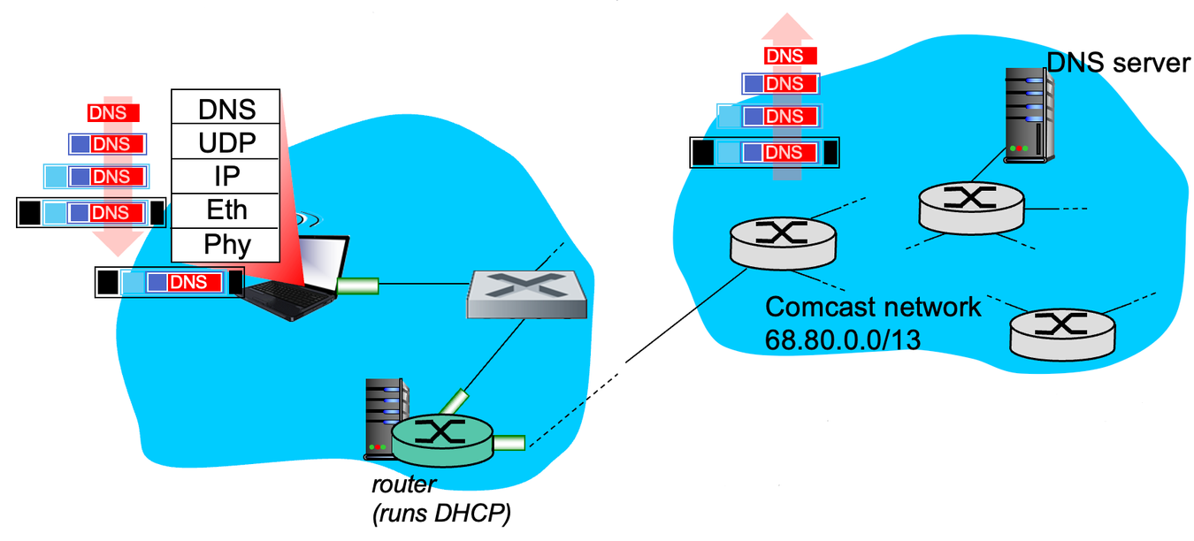 - DNS 쿼리 생성, UDP로 캡슐화, IP로 캡슐화, Eth로 캡슐화