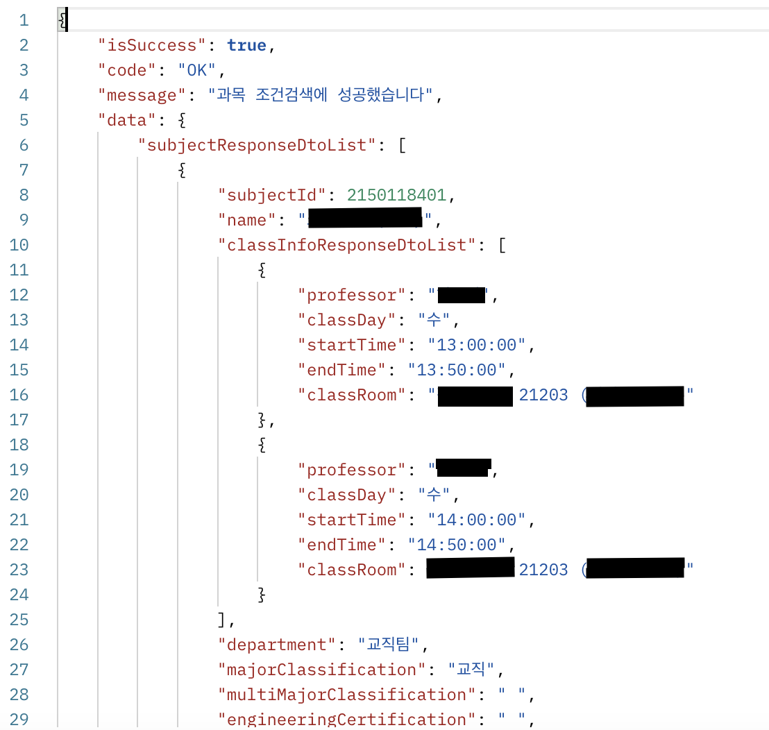 위에 있는 요청 예시에서 필드 값들을 바꿔서 요청을 보냈고 성공적으로 원하던 데이터를 응답 받았습니다.