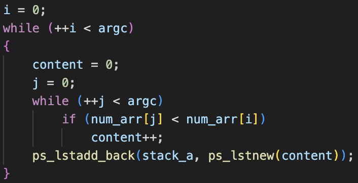 만약 "100 500 200 300 400"이 인자로 들어온다면 "0 4 1 2 3"으로 숫자가 바뀌어 stack_a에 들어가게 된다.