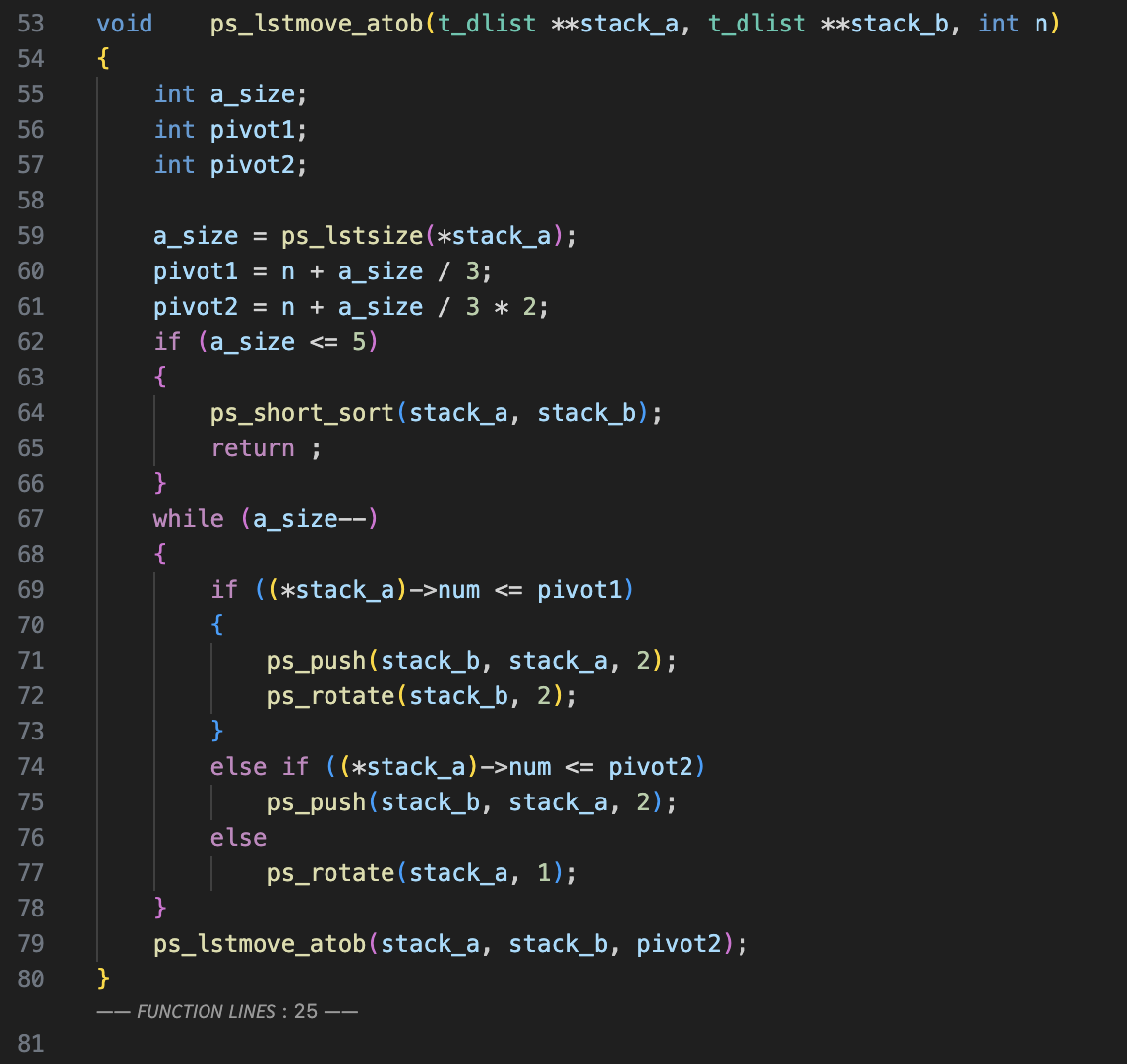 - stack_a의 원소를 3 등분하여 큰 값은 stack_b의 위쪽, 중간 값은 stack_b의 아래쪽, 작은 값은 stack_a의 아래쪽으로 이동시킨다.