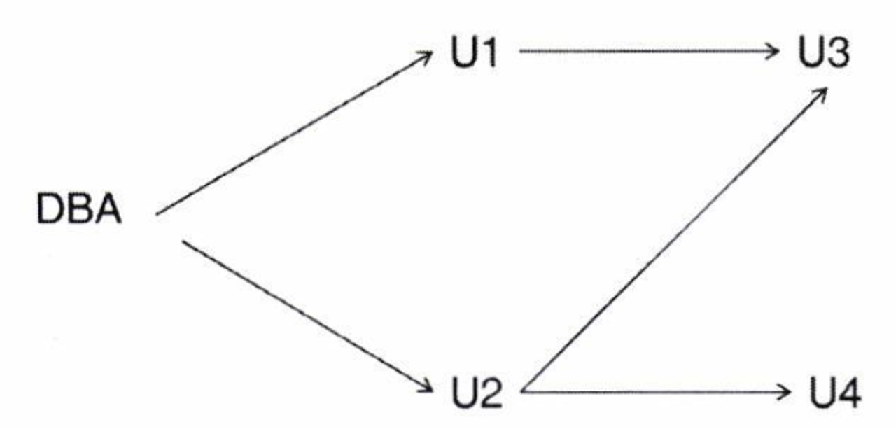 사용자 U1, U2가 동일 권한을 사용자 U3부여할 수 있으며, 사용자 U1이 권한 취소를 하여도 U3은 권한을 계속 가지고 있음(U2가 부여한 권한 존재)