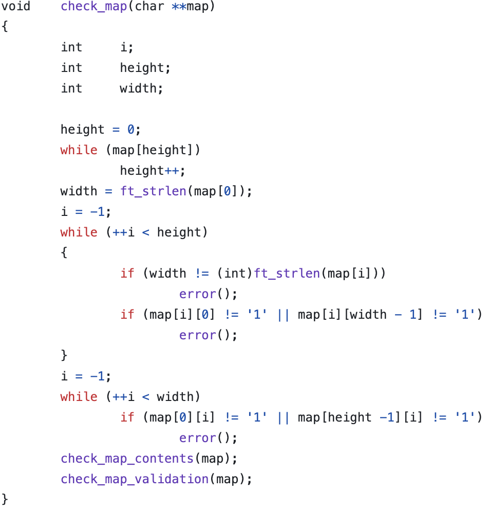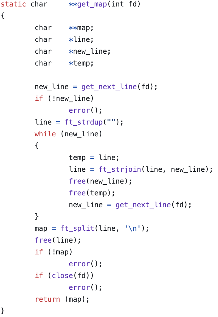 이전에 구현했던 get_next_line 함수를 활용하여 fd 값에서 한줄씩 읽어서 2차원 배열 map을 구한다. strjoin을 사용하고 메모리 해제를 해주지 않아서 평가에서 fail 받은 적이 있었다. 메모리 누수 항상 조심하자. ft_strdup 함수를 사용해서 줄 수를 줄이는 것은 팁이다.