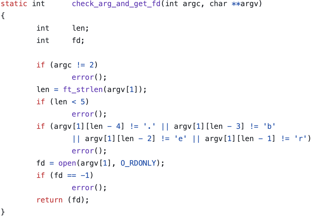 인자의 개수 검사, 확장자 검사, 인자로 받은 파일을 열어 fd 리턴의 기능을 순서대로 수행한다.