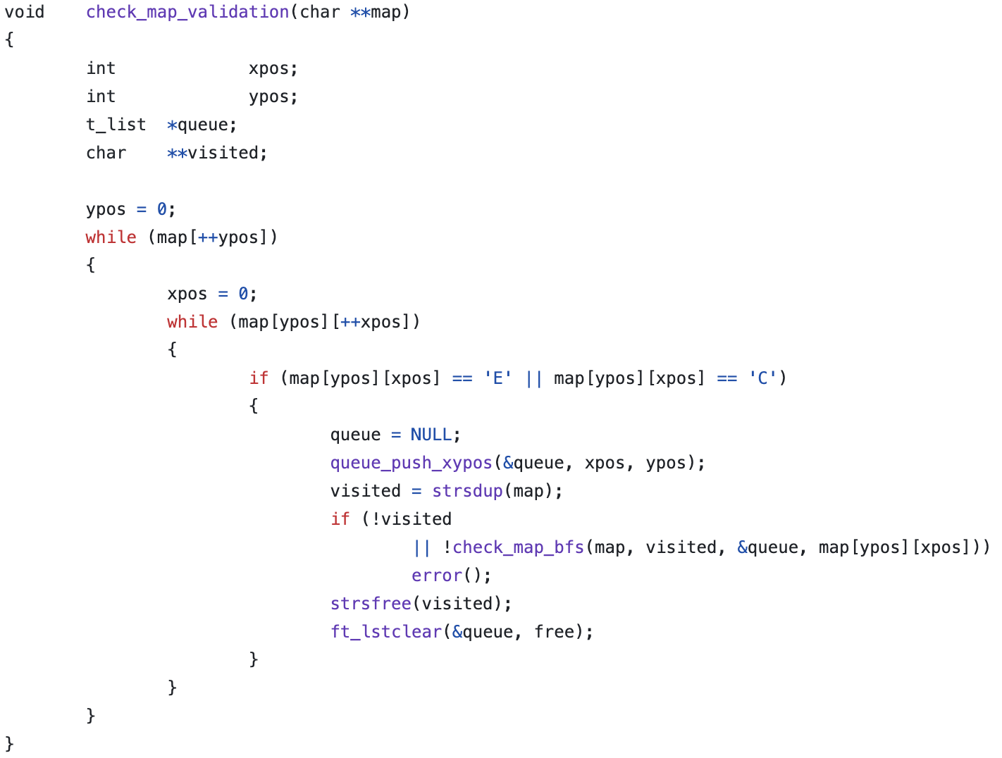 so_long의 시작이다. argv의 인자로 .ber 확장자인 파일 이름을 입력받는다. 입력받은 파일은 so_long 게임의 지도(map)가 된다. 이전에 so_long 평가를 갔었는데 main 문에 핵심 로직이 다 담기며 가독성이 좋고 간결한 코드를 보게 되어 영감을 받아 이런 코드를 작성하게 되었다. 다음은 각 함수에 대한 간단한 설명이다.