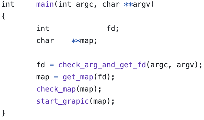 so_long의 시작이다. argv의 인자로 .ber 확장자인 파일 이름을 입력받는다. 입력받은 파일은 so_long 게임의 지도(map)가 된다. 이전에 so_long 평가를 갔었는데 main 문에 핵심 로직이 다 담기며 가독성이 좋고 간결한 코드를 보게 되어 영감을 받아 이런 코드를 작성하게 되었다. 다음은 각 함수에 대한 간단한 설명이다.
