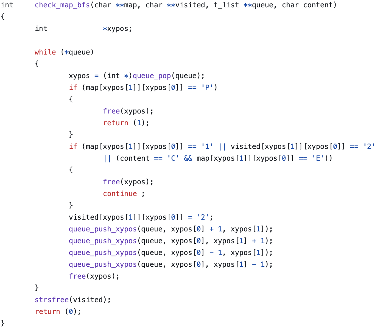 이번엔 42서울 2서클까지의 과제들 중 리트라이를 가장 많이 했던(무려 5번..!) so_long에 대한 글을 서보려고 한다. so long은 지도가 그려진 파일을 입력받아 클리어 가능하다면 화면에 게임을 출력하는 과제이다. 지도 파일의 예시는 다음과 같다.