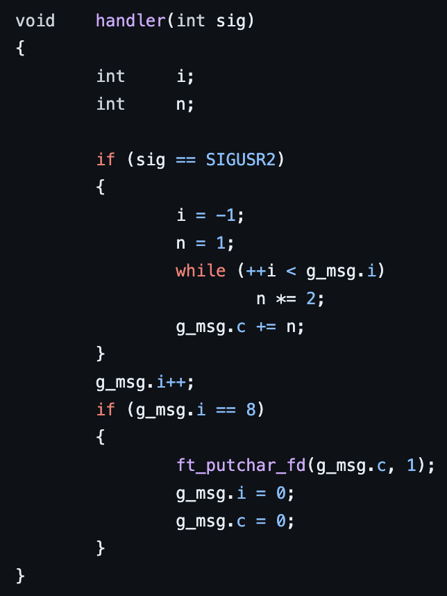 우리는 SIGUSR1, SIGUSR2 두 개의 시그널만 사용할 수 있으므로 입력받은 메시지를 보내기 위해 char 형태를 이진수로 바꾸고 그에 해당하는 시그널을 보내면 된다. 예를 들어 'A'의 아스키코드 값은 65이고 이를 이진수로 나타내면 1000001이다. 여기에 char 형은 1바이트 = 8비트를 저장 공간으로 사용하므로 모든 char 값을 보낼 수 있으며 서버가 signal 8번마다 시그널을 char 형으로 치환할 수 있도록 하기 위해서 8자리를 채워서 이진수 값으로 보내면 된다. A는 '01000001' 이런 식으로 8자리를 맞추면 된다. 나는 SIGUSR1 = 0, SIGUSR2 = 1로 치환하였다.