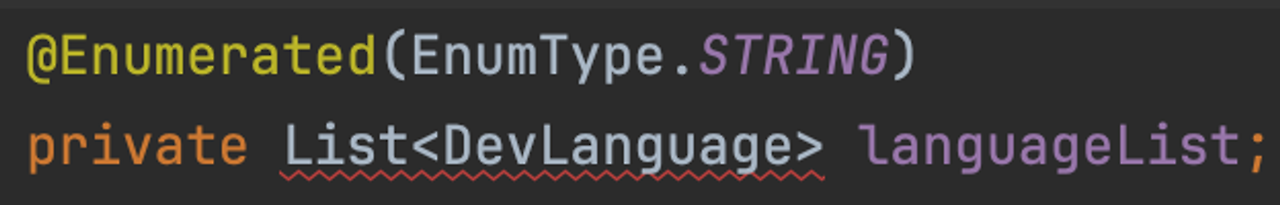 Project의 languageList가 Enum 클래스 DevLanguage의 JAVA를 가지고 있는 상황입니다. 이때 코드상으로 Enum에서 Java를 삭제하고 배포해도 문제가 생기지는 않으나 데이터베이스는 아직 JAVA에 대한 값을 저장하고 있어서 조회를 할 때 저장된 값이 현재 Enum 중 매칭되지 않아서 문제가 발생하게 됩니다.