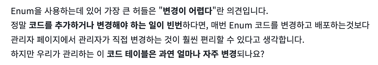 이러한 비효율을 해결하기 위해 다음 기술 블로그를 레퍼런스하여 Java의 Enum을 활용하기로 정하였습니다.