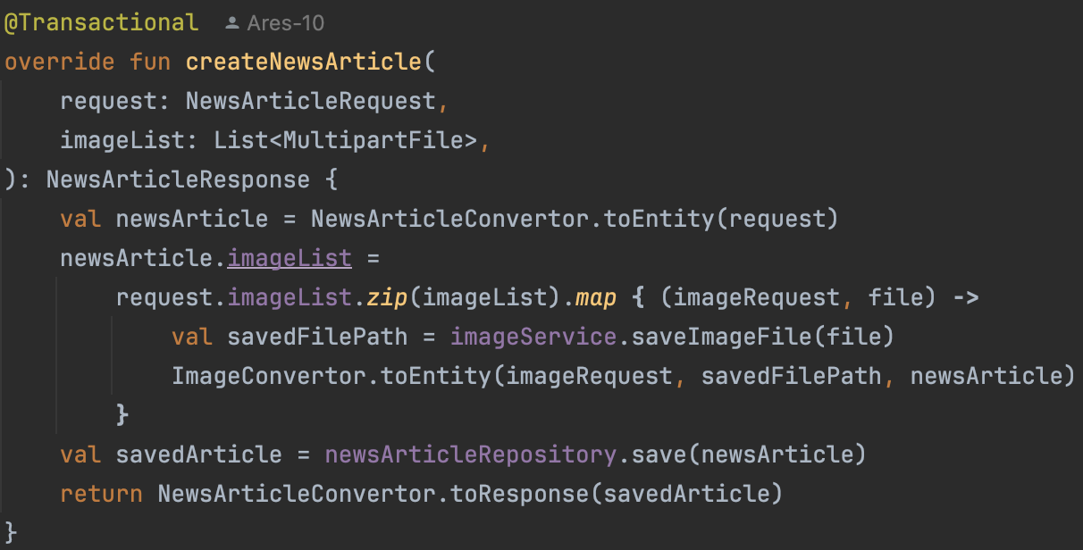 imageList와 request.imageList(캡션) 리스트를 zip으로 묶어 각 이미지를 저장 후 Image 객체를 생성하고 NewsArticle과 연관관계를 설정해 주었다.
