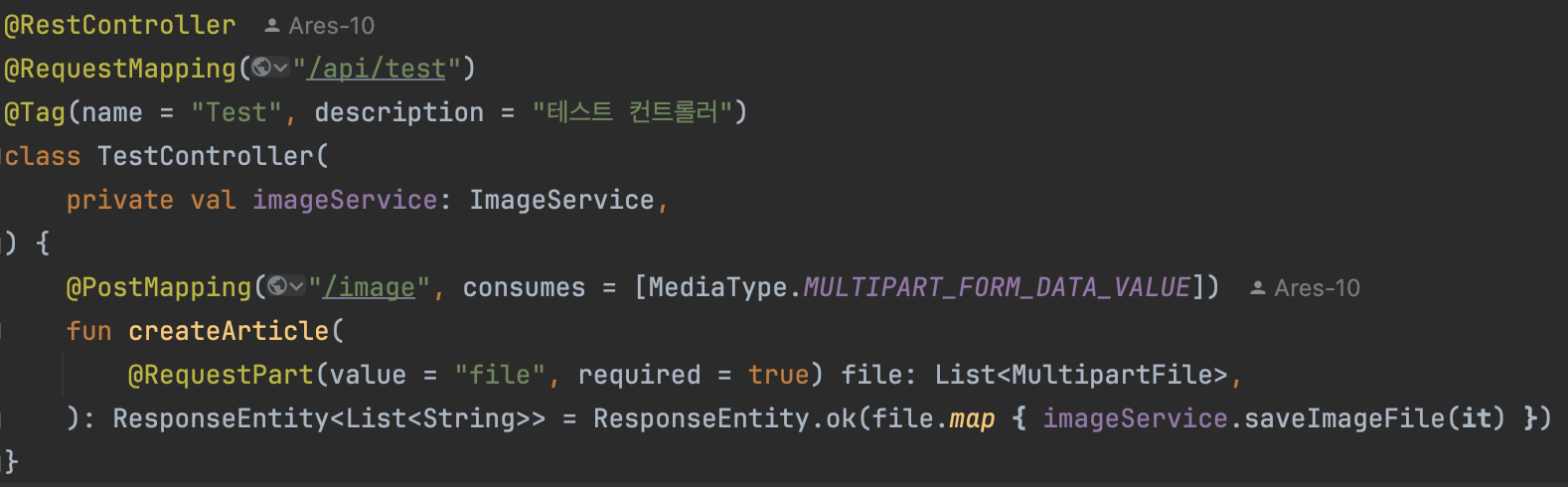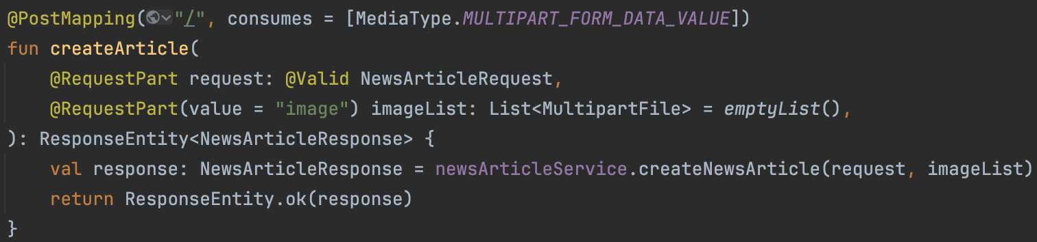 여러 이미지를 대한 입력받기 위해 @PostMapping(consumes = MediaType.MULTIPART_FORM_DATA_VALUE)를 추가해 준다. 파일 입력은 MultipartFile 클래스로 받을 수 있으므로 여러 파일을 입력받기 위해 List 형태로 지정해 준다.