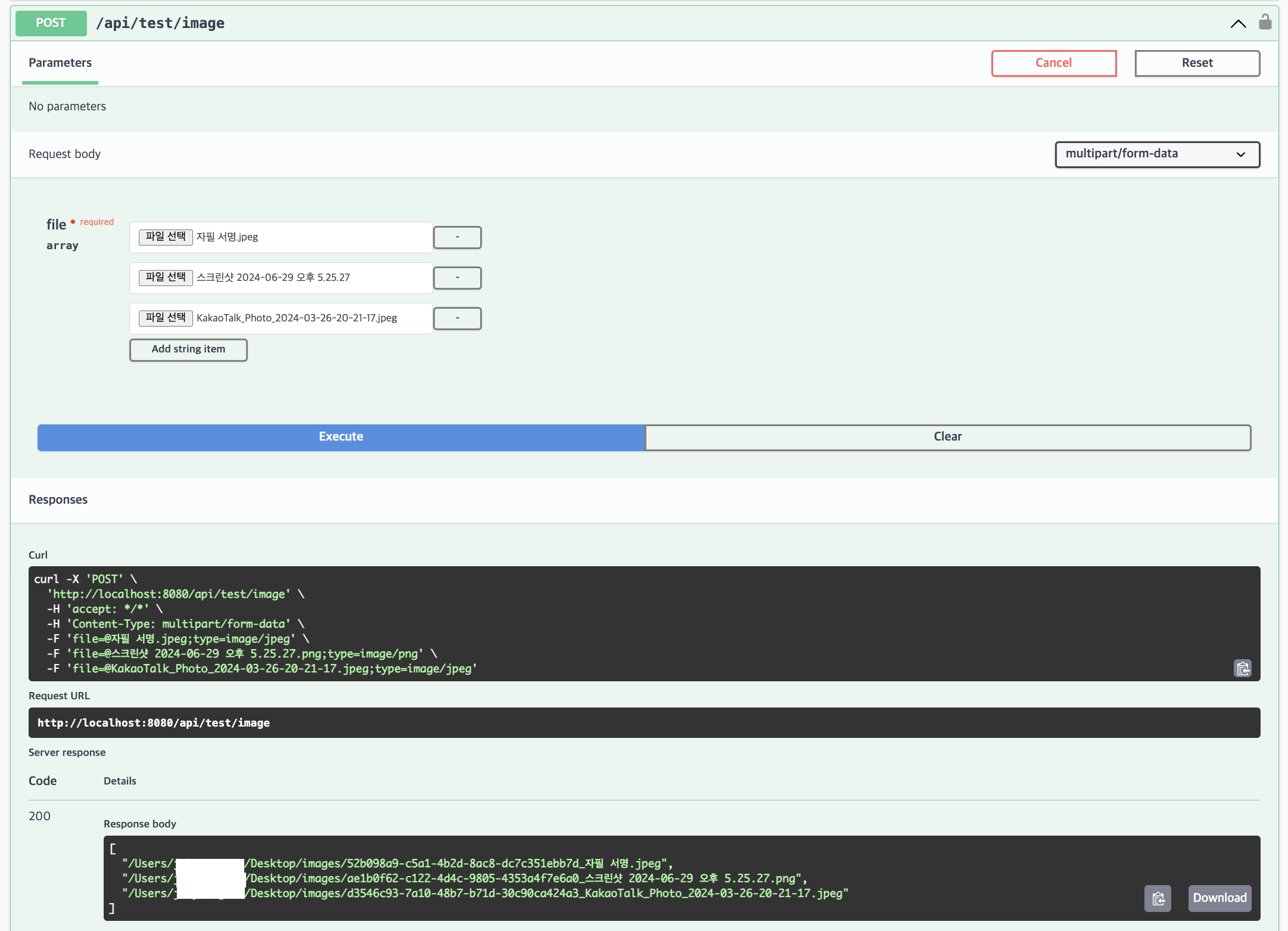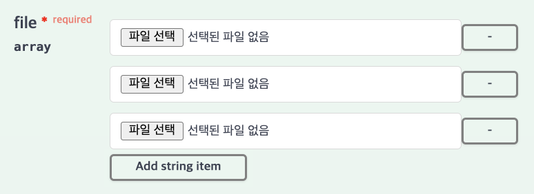 스웨거에는 다음과 같은 형태로 나온다 Add string item 버튼을 눌러서 입력할 file 개수를 정할 수 있다.