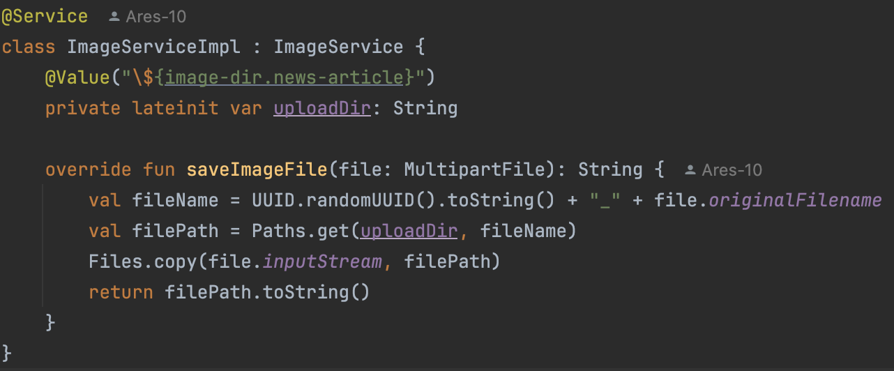 uploadDir은 입력받은 이미지를 저장하는 디렉터리 위치이다. 노출되지 않도록 yml 파일에서 환경변수로 빼주었다.