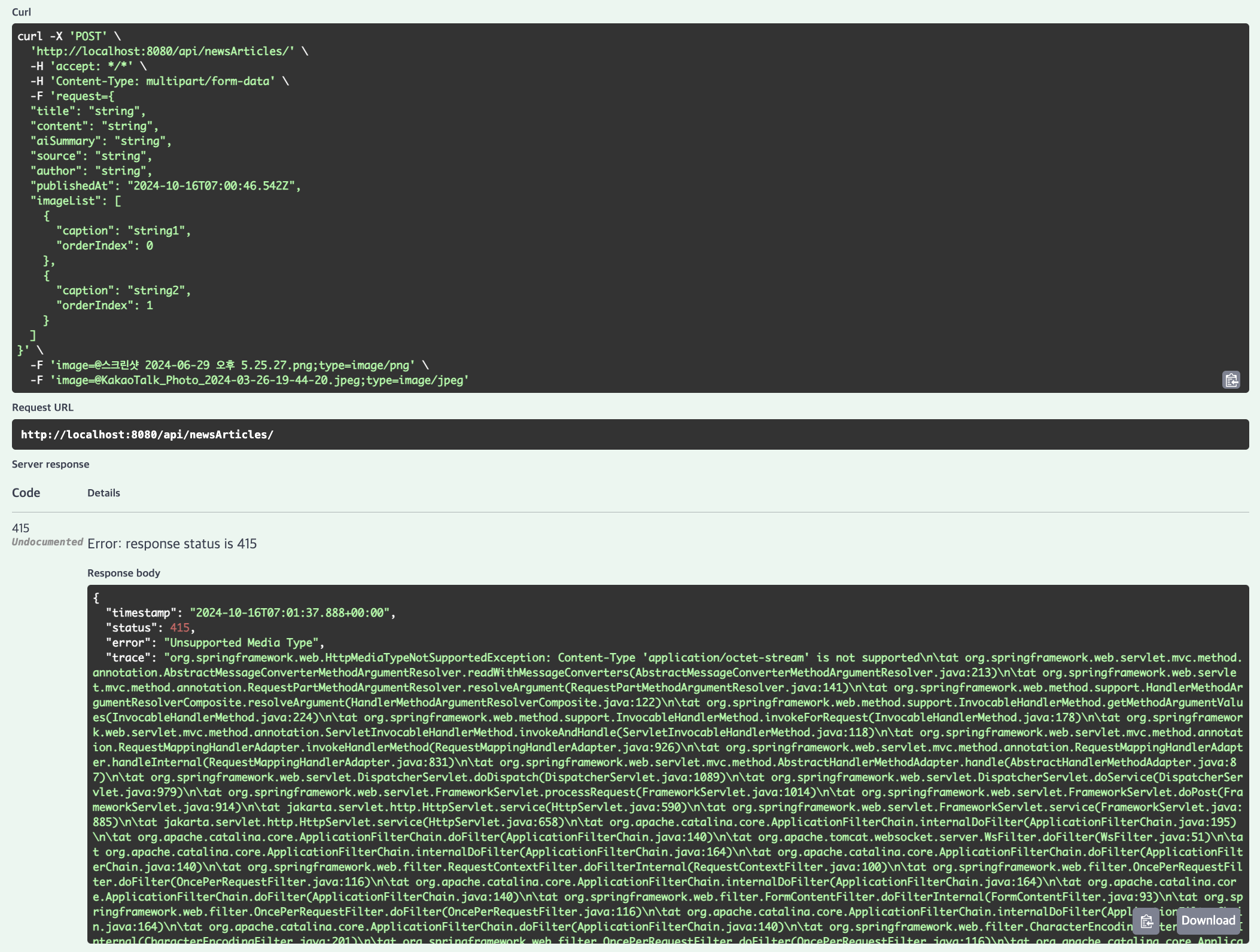잘 작동할 줄 알았으나 받은 응답은 415 Unsupported Media Type Error