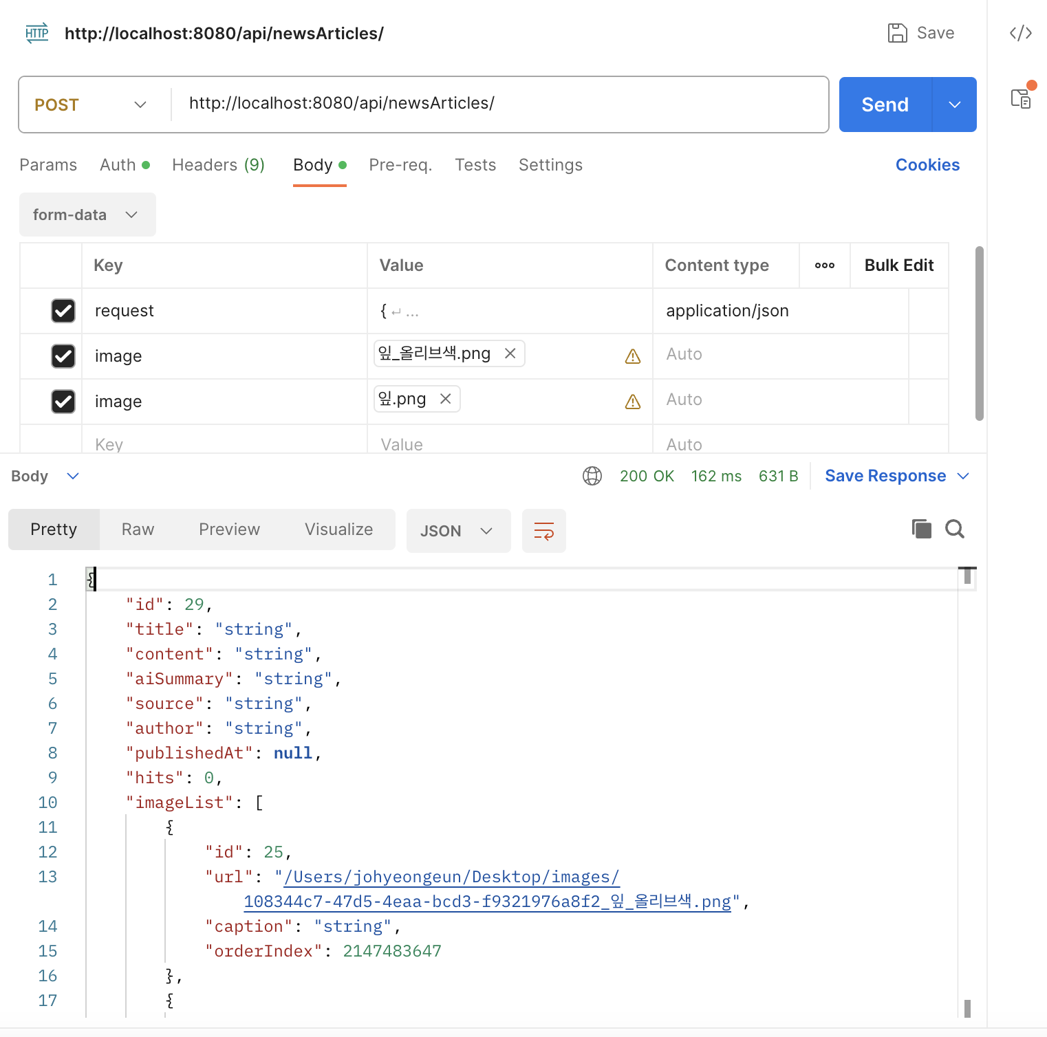 입력에서 Body 부분을 from-data 형식으로 지정한 후 request와 image 부분을 입력한다. 이때 request 부분에는 application/json을 명시해 주어야 올바르게 요청을 전달할 수 있다. Postman에서 시도했던 테스트는 성공적으로 작동했다.