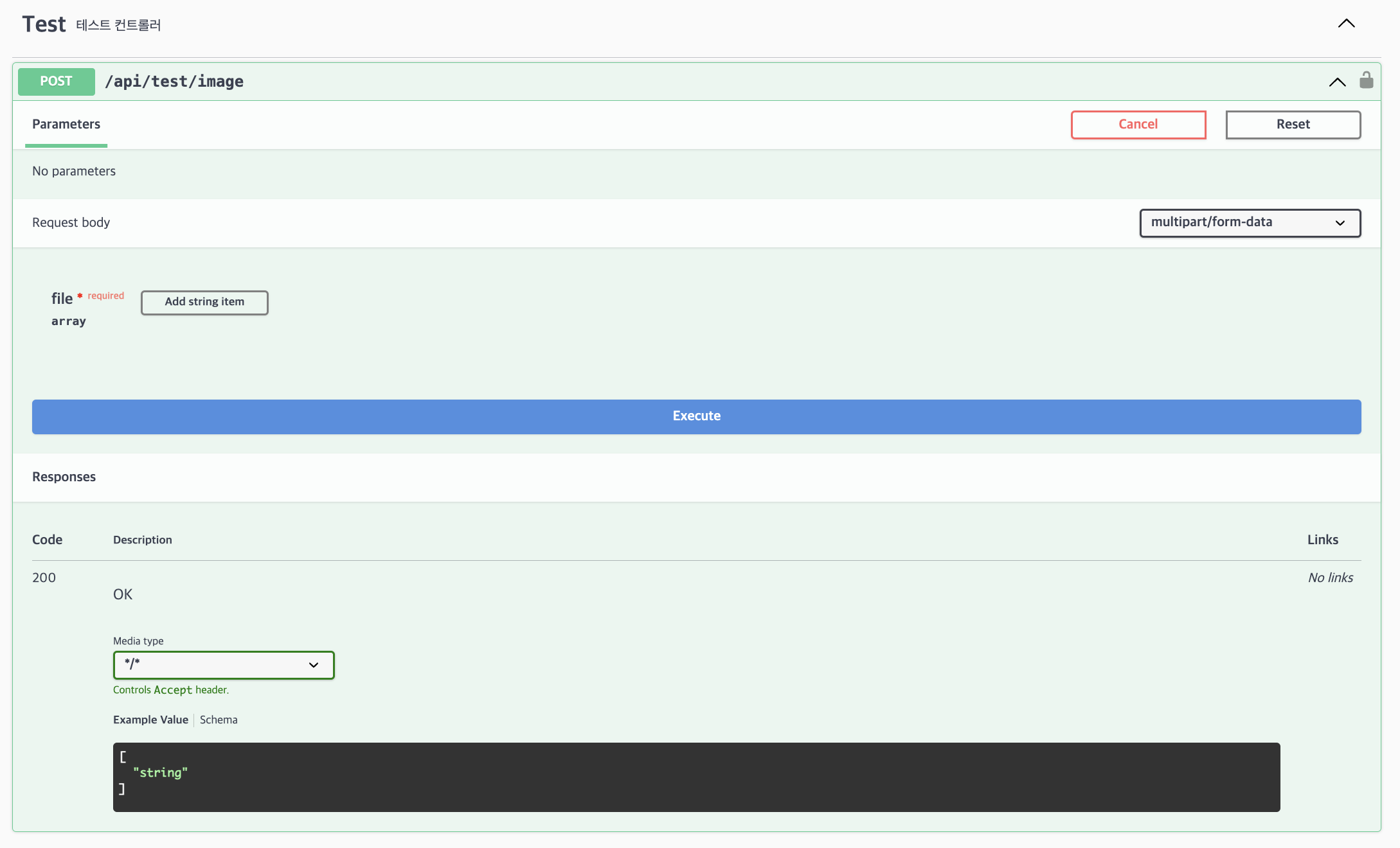 스웨거에는 다음과 같은 형태로 나온다 Add string item 버튼을 눌러서 입력할 file 개수를 정할 수 있다.