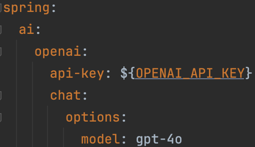 이때 주의해야할 점은 정확히 spring.ai.openai.api-key로 작성해야 한다. 그래야 spring에서 이 부분을 인식하고 가져다 쓴다.