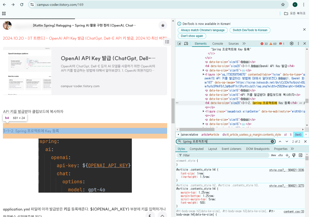목차 3-1-2. 내용을 얻기 위하여 개발자 도구의 요소 탭에서 crtl + f를 눌러 검색한다. 검색할 문자열로 "Spring 프로젝트에"를 입력하면 리소스의 위치를 확인할 수 있다.