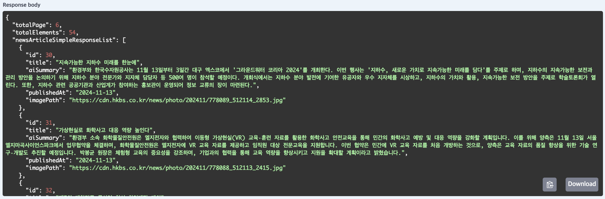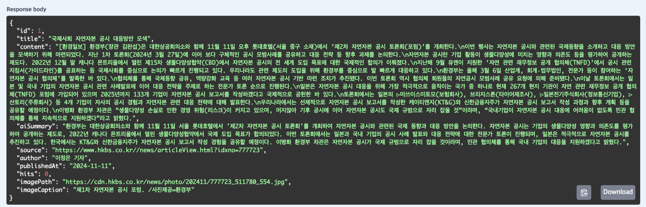 ESG 환경의 뉴스 기사를 수집해서 반환하는 코드이다. 주석을 달아놨으니 참고하면 된다.
