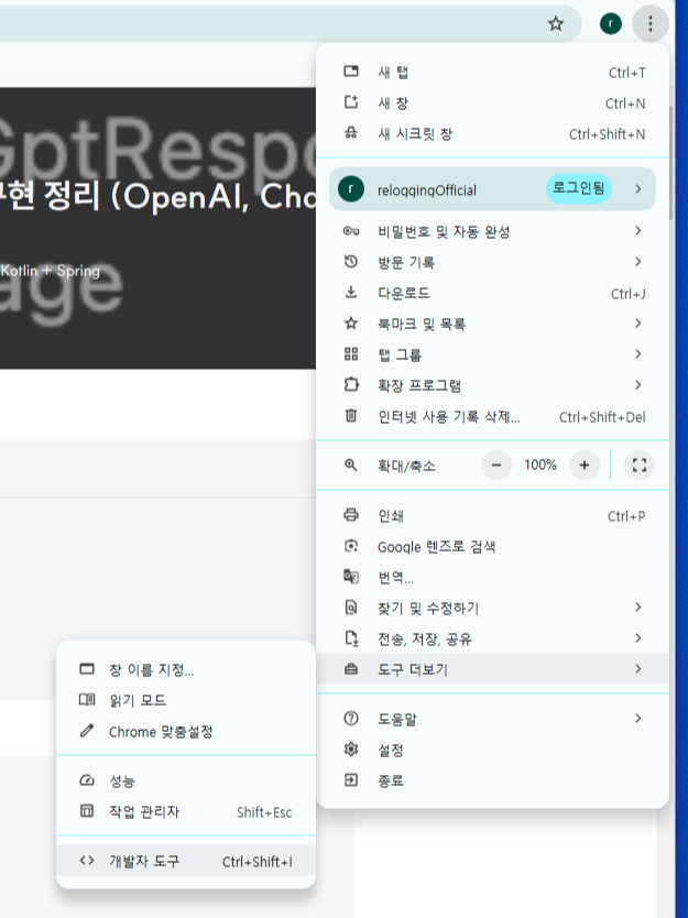 크롬 창 오른쪽 위 점 세 개를 클릭 -> 도구 더 보기 -> 개발자 도구