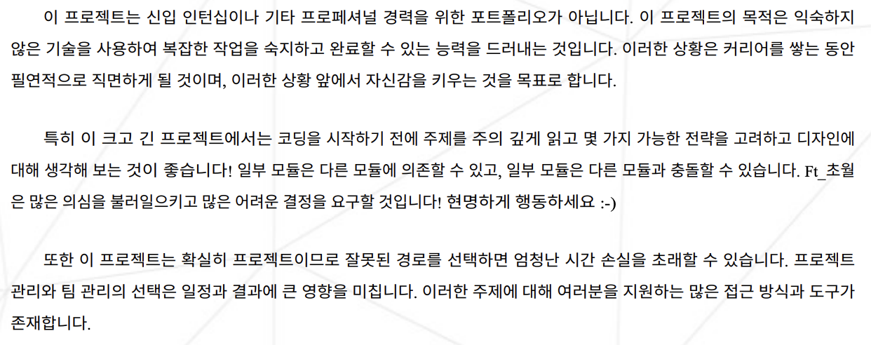 42는 다른 대외활동과 달리 특정 기술 스텍의 숙련도가 아닌, 개발 자체에서 발생하는 문제 해결 능력을 기르는 데 초점이 맞춰진 대외활동이라는 것을 다시 한번 느낀다. 익숙하지 않은 기술을 사용하여 복잡한 작업을 숙지하고 완료할 수 있는 능력을 드러내는 것이라니..