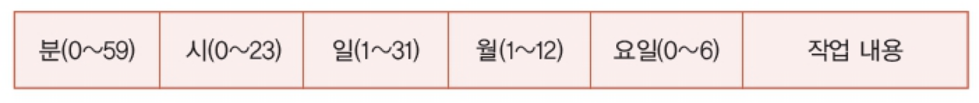 - crontab 파일의 한 행은 다음과 같이 여섯 항목으로 구성