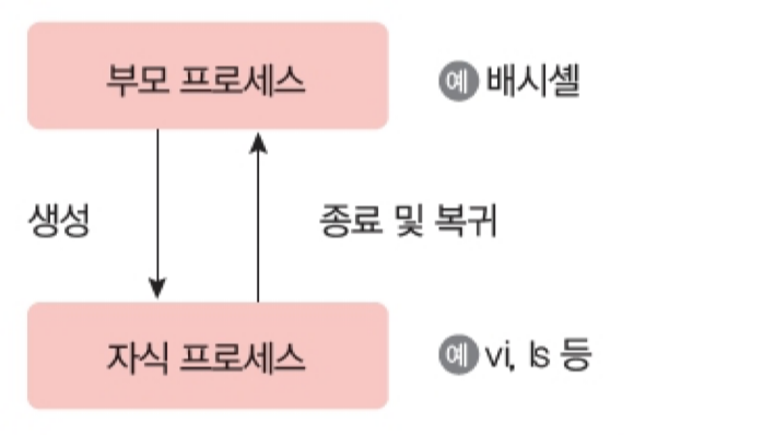 - ls 등 명령어: 사용자가 사용하는 명령어, 셸에 의하여 프로세스로 새롭게 생성
