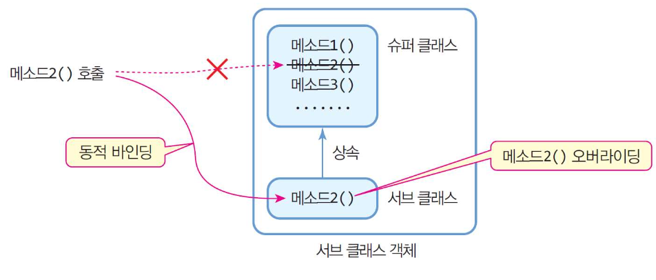 - 상속을 통해 '하나의 인터페이스(같은 이름)에 서로 다른 내용 구현'이라는 객체 지향의 다형성 실현