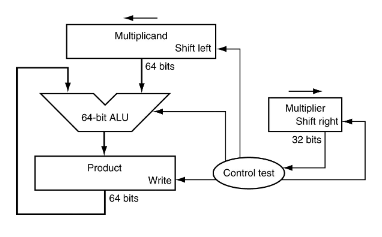 - 64비트 피승수 레지스터는 64비트 곱 레지스터에 축적되는 합과 피승수의 위치를 맞추기 위해 매 단계마다 1 비트 왼쪽으로 자리이동