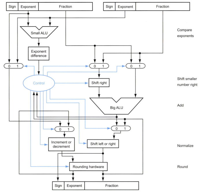 - 작은 유효자리가 오른쪽으로 자리 이동된 후 큰 ALU에서 큰 수의 유효자리와 더해짐