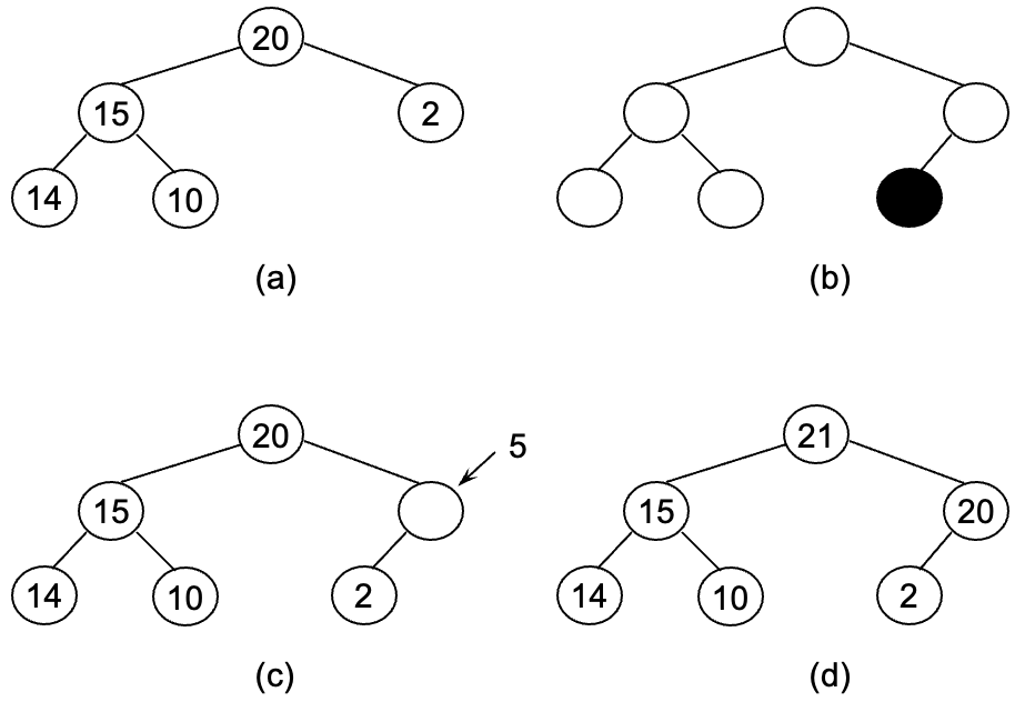 - 새로 삽입되는 원소는 부모 원소와 비교하면서 최대 히프가 되는 것이 확인될 때까지 위로 올라감