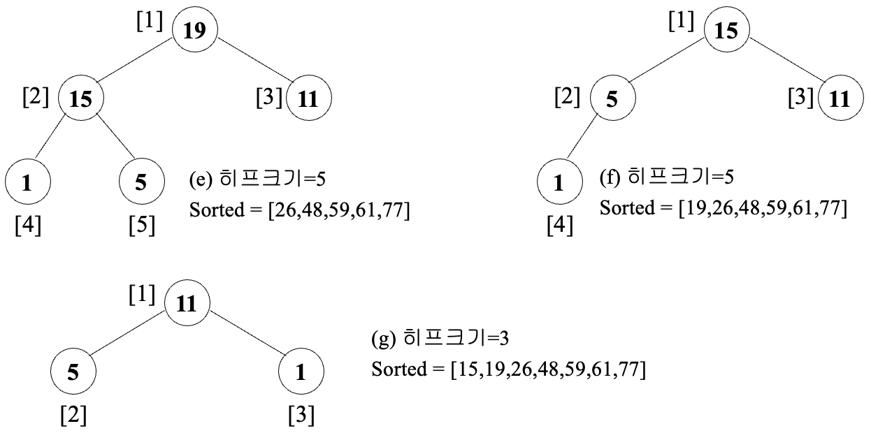 최대 키를 가진 레코드가 정렬된 배열의 정확한 위치에 자리 잡게 됨 - 히프의 크기를 줄인 후 히프를 재조정