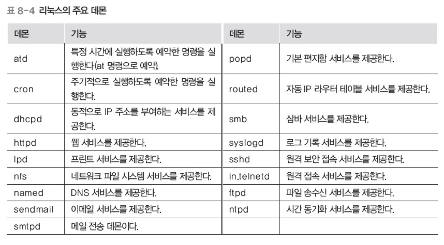 - 커널 데몬 : 커널의 일부분을 프로세스처럼 관리하는 데몬