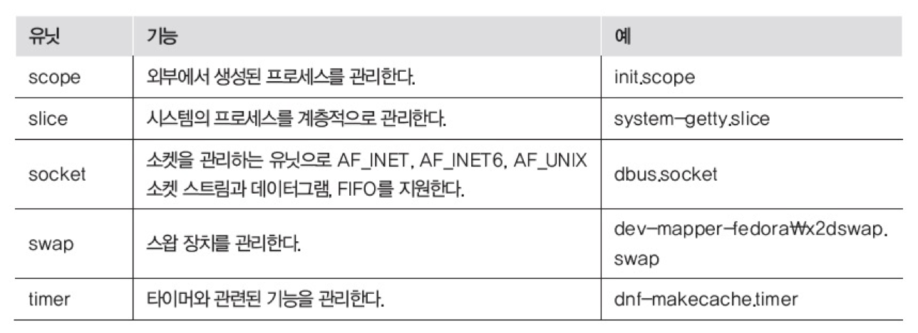 - systemd는 전체 시스템을 시작하고 관리하는 데 유닛이라 부르는 구성 요소를 사용
