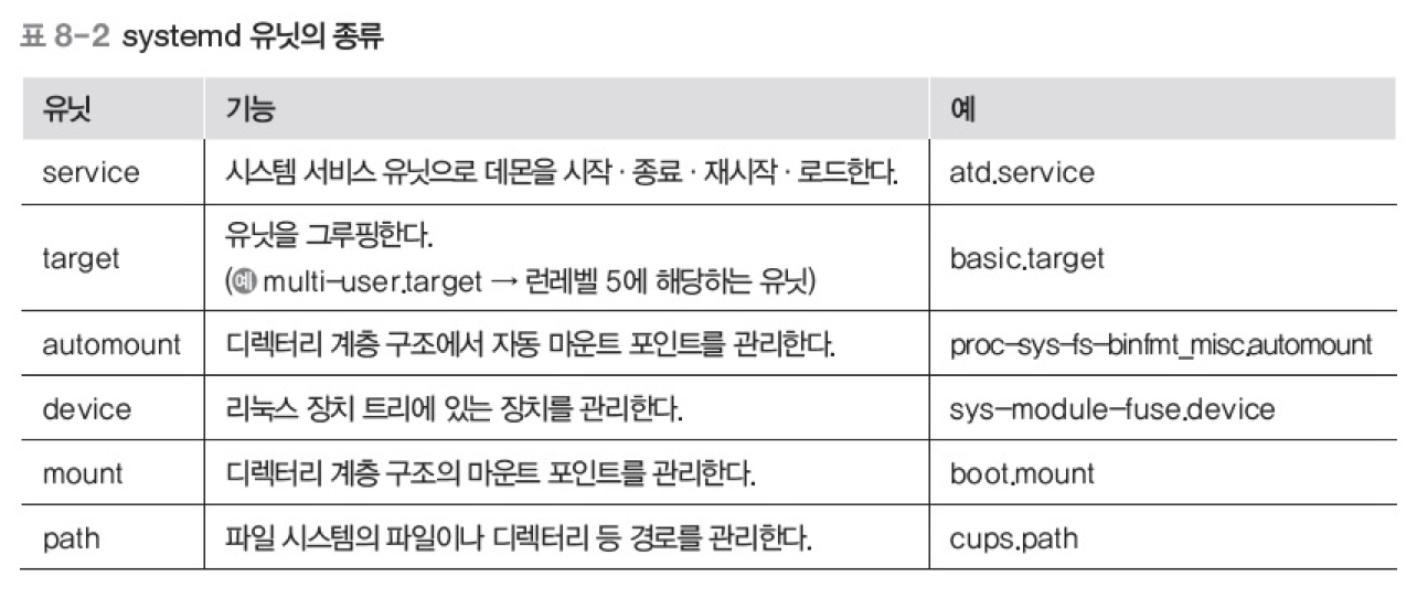 - systemd는 전체 시스템을 시작하고 관리하는 데 유닛이라 부르는 구성 요소를 사용