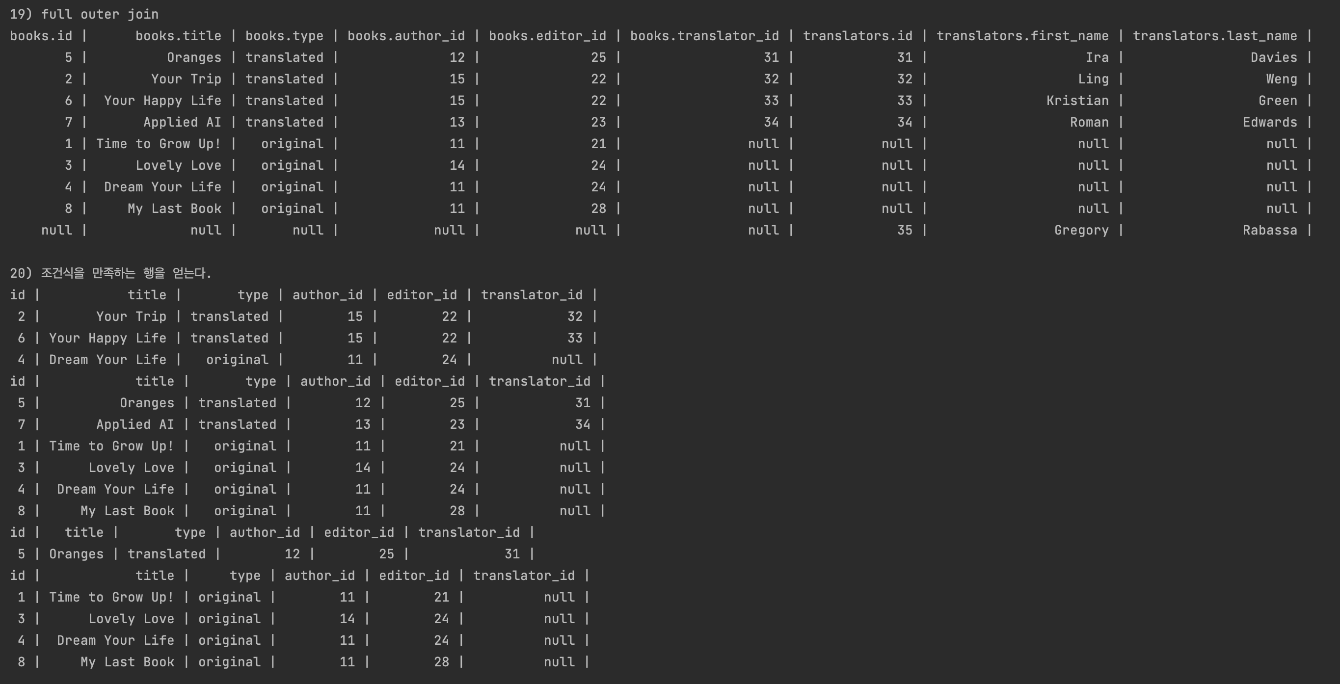 System.out.println("\n20) 조건식을 만족하는 행을 얻는다.");