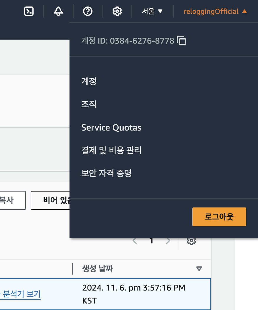 AWS 계정 로그인 이후 오른쪽 위 계정 이름을 클릭한 후 보안 자격 증명 클릭