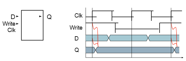 - 쓰기 제어 입력이 1인 경우 클럭 에지에서만 업데이트됨